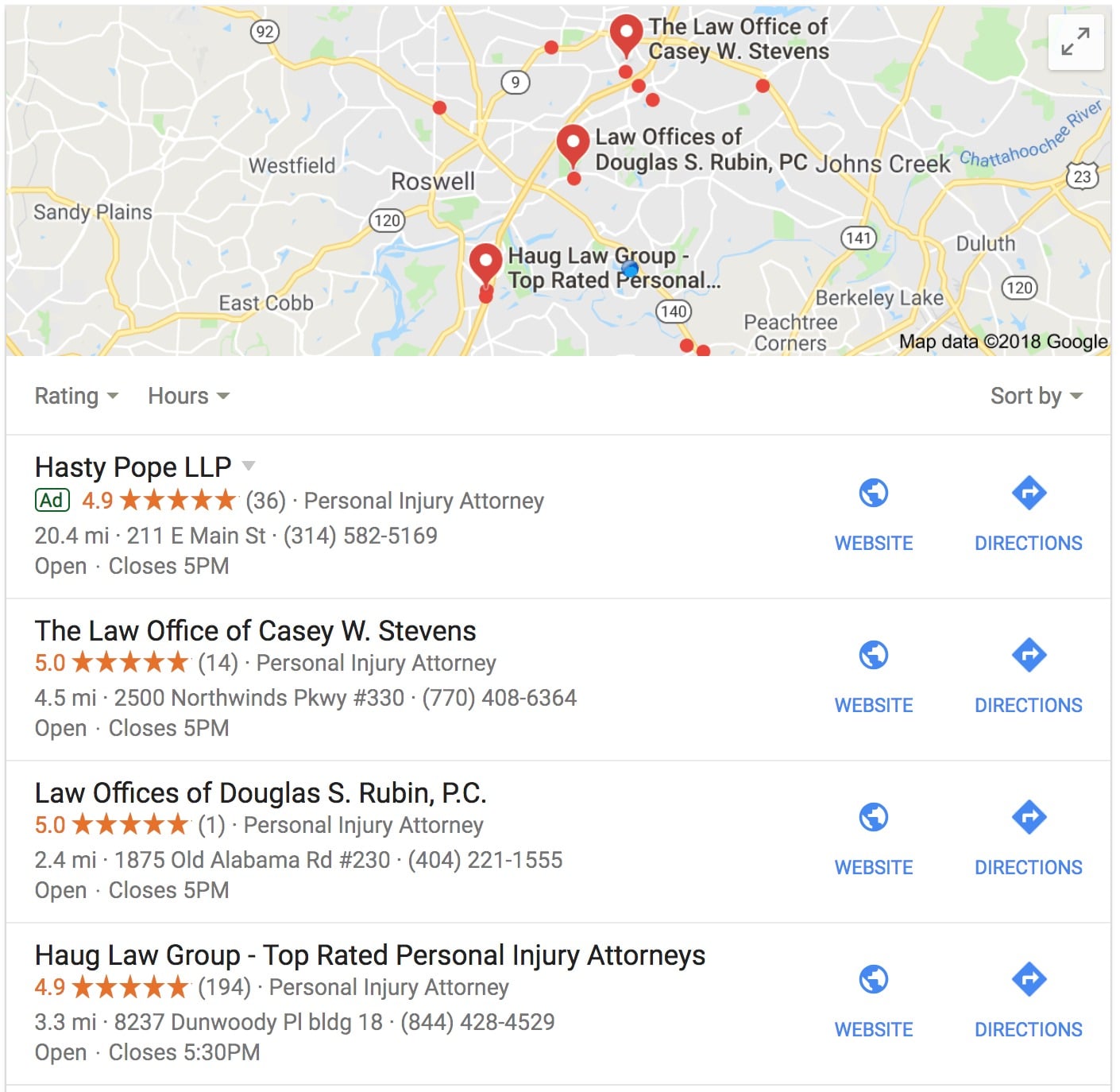 For instance, following the “top personal injury attorney” example mentioned above, we can see that query is searched approximately 390 times per month across the United States. That doesn’t seem like much, but I see a related query for “personal injury attorney” gets 33,000 searches per month in the US. When searching that query in Google, I get the same list.