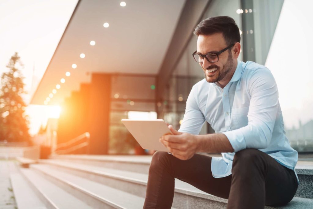 Portrait of businessman in glasses holding tablet outdoors